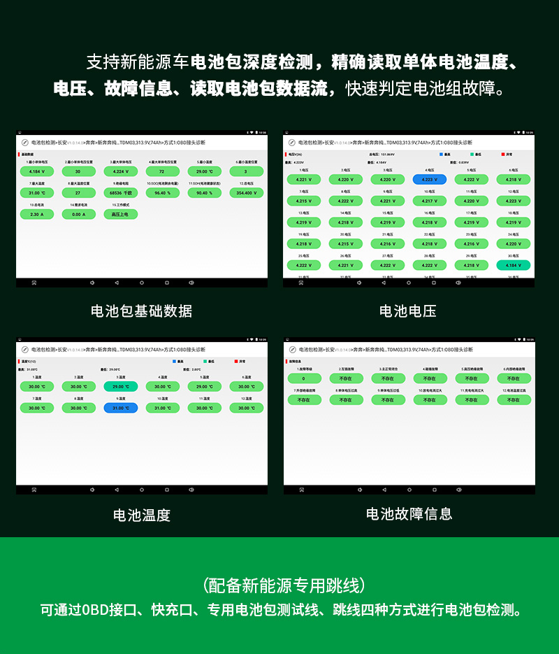 •支持电池包的基础数据检查,电池电压,电池温度,电池故障信息。